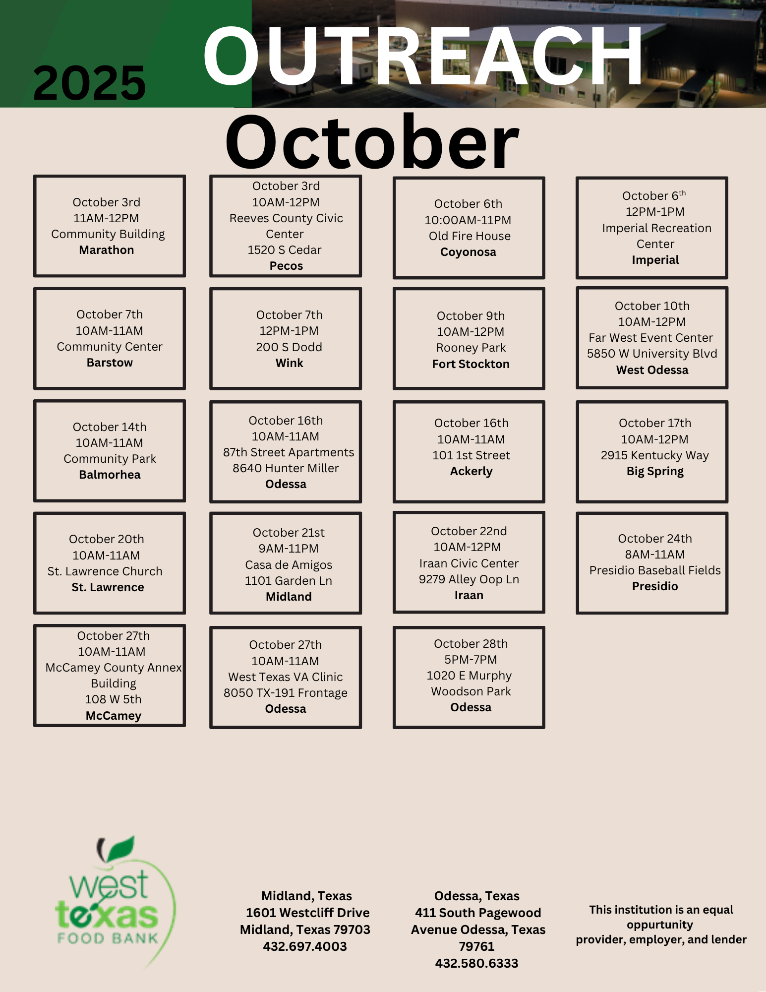**Beginning January 1st, 2026, the West Texas Food Bank will be ending in-house pantry distributions. We encourage our community to visit our outreach locations and partner agencies for regular food assistance opportunities.